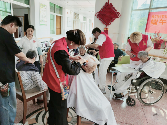 活动前夕,公寓提前为长者们送上了端午“新颜”礼——特邀专业理发师团队开展“爱心义剪”公益服务。理发师们耐心倾听长者需求,精心修剪发型。剪刀在发丝间轻盈翻飞,梳子梳理着岁月的痕迹,更传递着无微不至的关怀。一位刚理完发的爷爷高兴地说道,“理了发,整个人都精神多了,过节更有劲儿了!”。浓浓的敬老情,让长者们从“头”开始,容光焕发地迎接佳节到来。