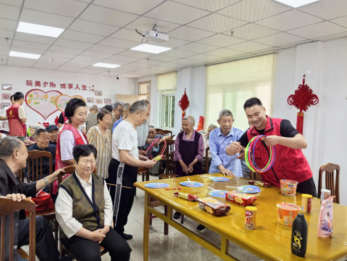 主题活动以介绍端午历史与民俗开场,习俗分享环节更是热闹非凡,陈奶奶手舞足蹈地描绘着家乡赛龙舟时热闹的场景,罗爷爷则深情回忆起儿时与家人一起腌制咸鸭蛋的点滴。大家你一言我一语,欢声笑语汇聚成节日的暖流。随后的套圈、“滚滚乐”等趣味游戏,吸引长者踊跃参与,每当投中瞬间,欢呼雀跃声随之响起“中了!又中了!”。大家在轻松愉悦的氛围中,共同感受着传统文化的魅力与节日的喜悦。