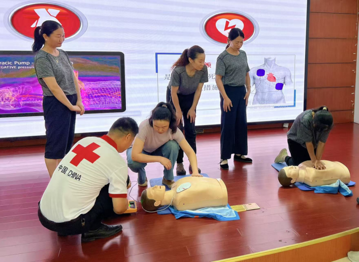 市红十字救护培训师胡敦敏以身边真实案例切入,详细讲解CPR操作流程、AED使用步骤及急救“黄金四分钟”的重要性,通过图文演示、真人模拟等形式,将专业急救知识转化为易懂易学的技能。随后,参训职工分组在模拟人上练习胸外按压、人工呼吸及AED操作,讲师逐一纠正动作,确保人人过关。青年理论学习小组成员带头示范,展现扎实学习成效。