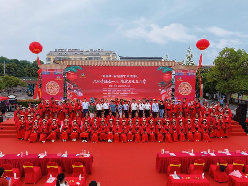 作为全市婚俗改革“排头兵”,舒城县以“只此青绿九一六 缘定三生五二零”为主题,在九一六茶园举办“舒城红·茶山囍约”集体婚礼。52对新人身着中式礼服漫步茶园,在青山绿水间完成简约庄重的传统仪式。