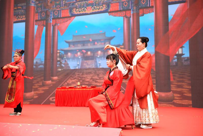霍邱县举办第三届“天赐良缘 情定蓼城”青年汉式集体婚礼,23对新人着汉服行结发礼,通过沃盥礼、同牢礼等传统仪程,让新人感受中华婚俗文化的庄重与浪漫,推动“重登记、强责任、崇节俭”理念深入人心。